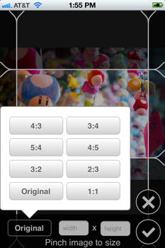 Cropping is perhaps the most common change applied to any image. As such it has occupies the first position in the Canvas tab when you begin editing an image. The text fields above the crop button (iPad) or on the cropping view allow you to specify a ratio such as 5x4, 1x1, etc. If you leave these fields blank, the ratio will be automatically set to the original ratio of the image. Tapping the crop button brings up the cropping interface as pictured below. The area inside of the white lines will be the final image. You can pinch to zoom the image, and move it around to reposition. If you want to change the cropping ratio at this point, you can drag around the cropping lines as well.