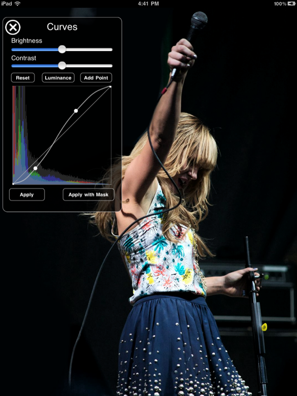 Though Filterstorm had some RAW support, it was always advertised for use with jpegs as it had issues with larger files. No more. Filterstorm Pro will not only open RAW files from high resolution cameras (see Apple's list of supported RAW formats in iOS), but will export images up to 22 Megapixels if you have an iPad 2 (7.5 on iPad 1). That's right, you can not only edit, but export 5DMk2 images at their full resolution.