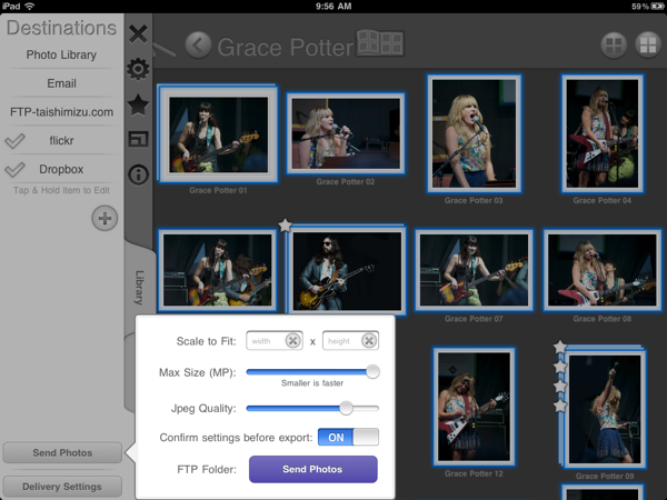 Filterstorm Pro's built-in library is more than just for show. It allows you to select, rate, edit, add metadata, and publish many images at once. You can change the IPTC data of an entire collection, and add a watermarks to everything in a few simple taps, then select where you want to send the images to, and FTP them all at once.