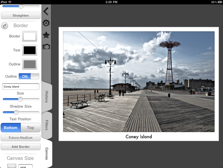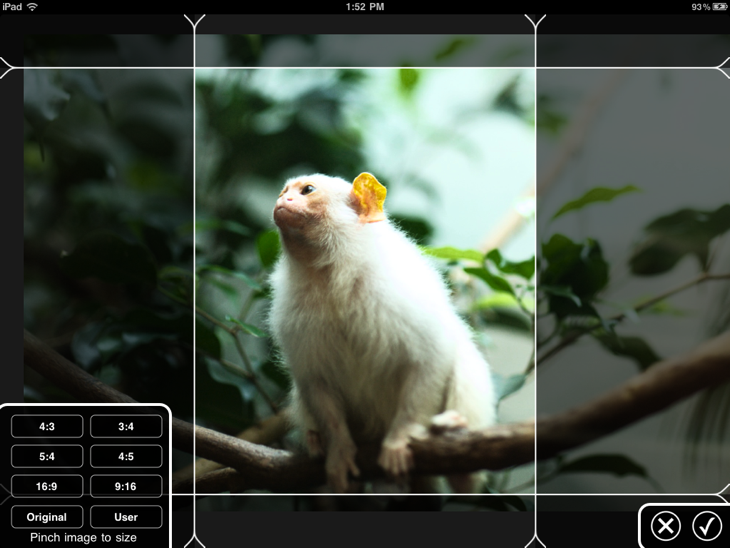 Cropping is perhaps the most common change applied to any image. As such it has occupies the first position in the Canvas tab when you begin editing an image. The text fields above the crop button allow you to specify a ratio such as 5x4, 1x1, etc. If you leave these fields blank, the ratio will be automatically set to the original ratio of the image. Tapping the crop button brings up the cropping interface as pictured below. The area inside of the white lines will be the final image. You can pinch to zoom the image, and move it around to reposition. If you want to change the cropping ratio at this point, you can drag around the cropping lines as well.
