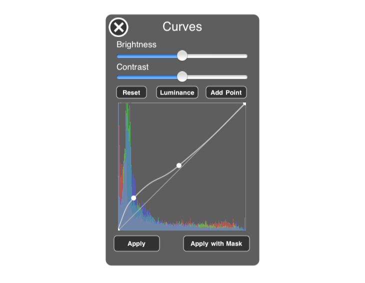 FSPro's curves work fairly similarly to most other curves with a few differences. On many desktop programs, clicking somewhere on the curve without a point will add a new point. Due to the imprecise nature of fingers, this is not true in FSPro. When you place your finger down on the curve control, FSPro determines which point is closest to your finger. When you slide your finger, it moves that point. If you wish to add a new point to the curve, tap the "add point" button, then your next tap will create a new point under your finger.